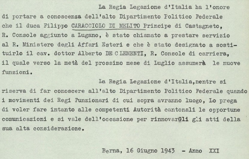 Carlo Caracciolo una volta liberato entrò una seconda volta illegalmente in Svizzera. Il passaggio si fece durante le vicisittudini della Zona Libera Ossola. L’effimera “Repubblica Partigiana Ossola” che per quarantaquattro giorni, dal 10 settembre al 14 ottobre 1944, riuscì ad esistere in un’Italia ancora soggiogata dal fascismo e occupata dalle forze naziste. Carlo entrò con la madre il 19 settembre 1944 nei pressi del confine di Camedasca-Camedo. Un passaggio arduo, tanto che la madre dovette essere trasportata in spalla da Virgilio Guidetti. Guidetti era non solo il capo-stazione della Centovallina di Camedo, ma anche la persona di contatto del capitano Guido Bustelli, responsabile a sua volta del servizio d’informazioni militare elvetico per il Canton Ticino. Dopo esser giunto in Ticino, Carlo riprese il suo ruolo d’intermediario, forte delle sue competenze linguistiche presso Carlo Pontremoli.